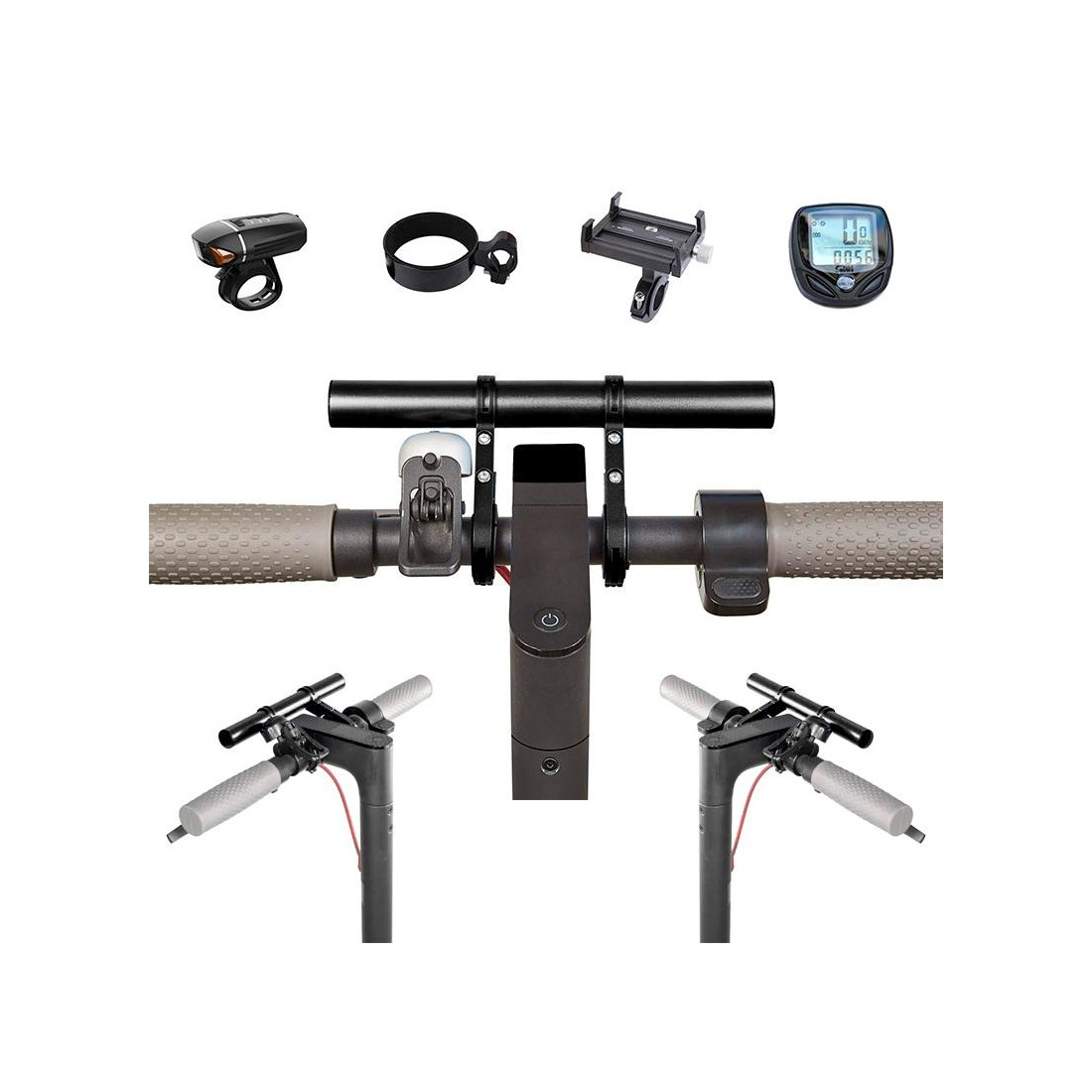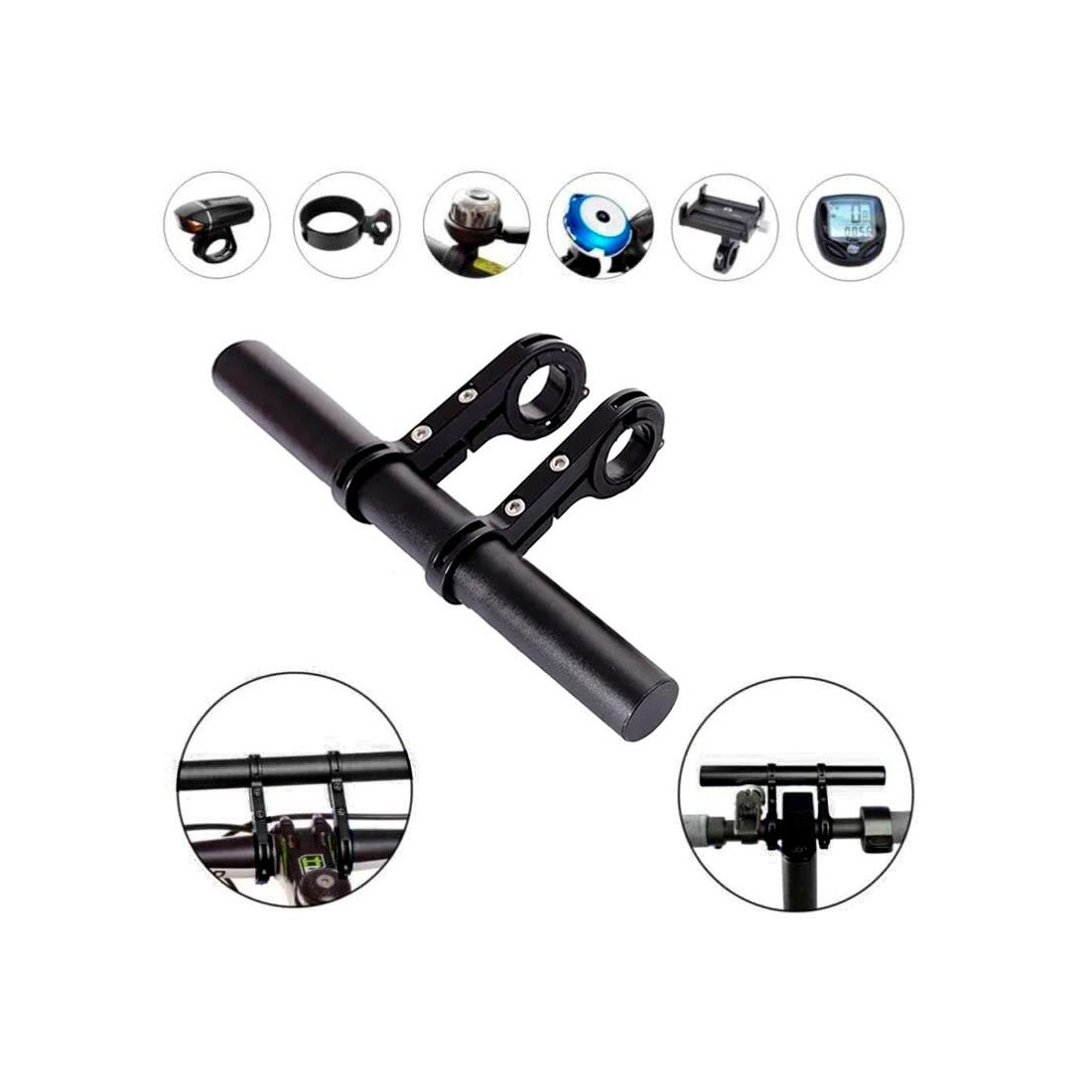 Extensie pentru ghidon, fabricată din aliaj de aluminiu, concepută pentru montarea accesoriilor precum suport pentru telefon, lanternă, sonerie etc.